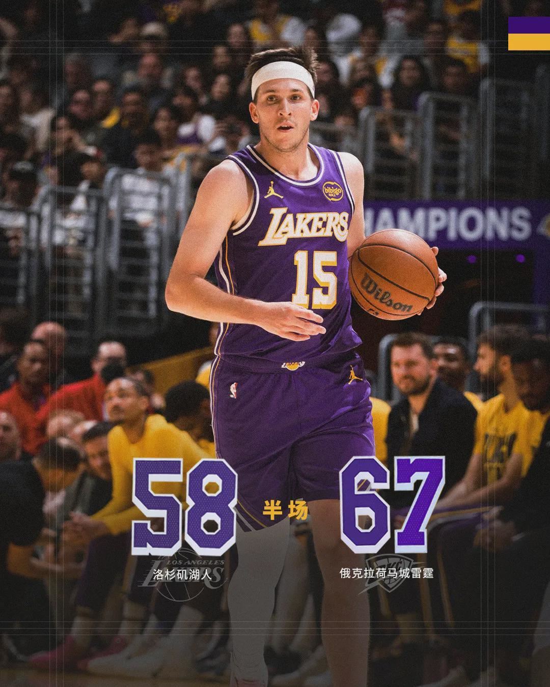 半场战罢,雷霆67-58领先湖人9分。湖人上半场三分球15中4,其中第二节单节6中1。以赛亚-乔半场7中6高效砍下16分,湖人里夫斯12分6助,詹姆斯8分2篮板3助攻3失误。易边再战,詹姆斯连续砍分,第三节单节4中3得到10分。
