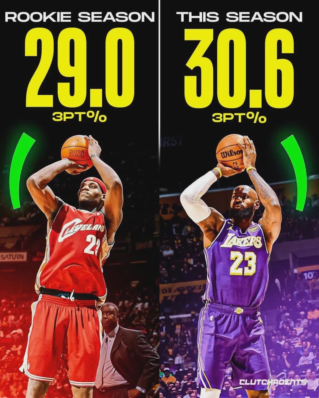 詹姆斯连续21年入选全明星首发的纪录,上个月也被终结了,不过他后来以全明星替补的身份入选。詹姆斯本赛季三分命中率30.6%,职业生涯第二低,仅高于新秀赛季的29%。本赛季詹姆斯打了35场比赛,三分球合计160投49中。