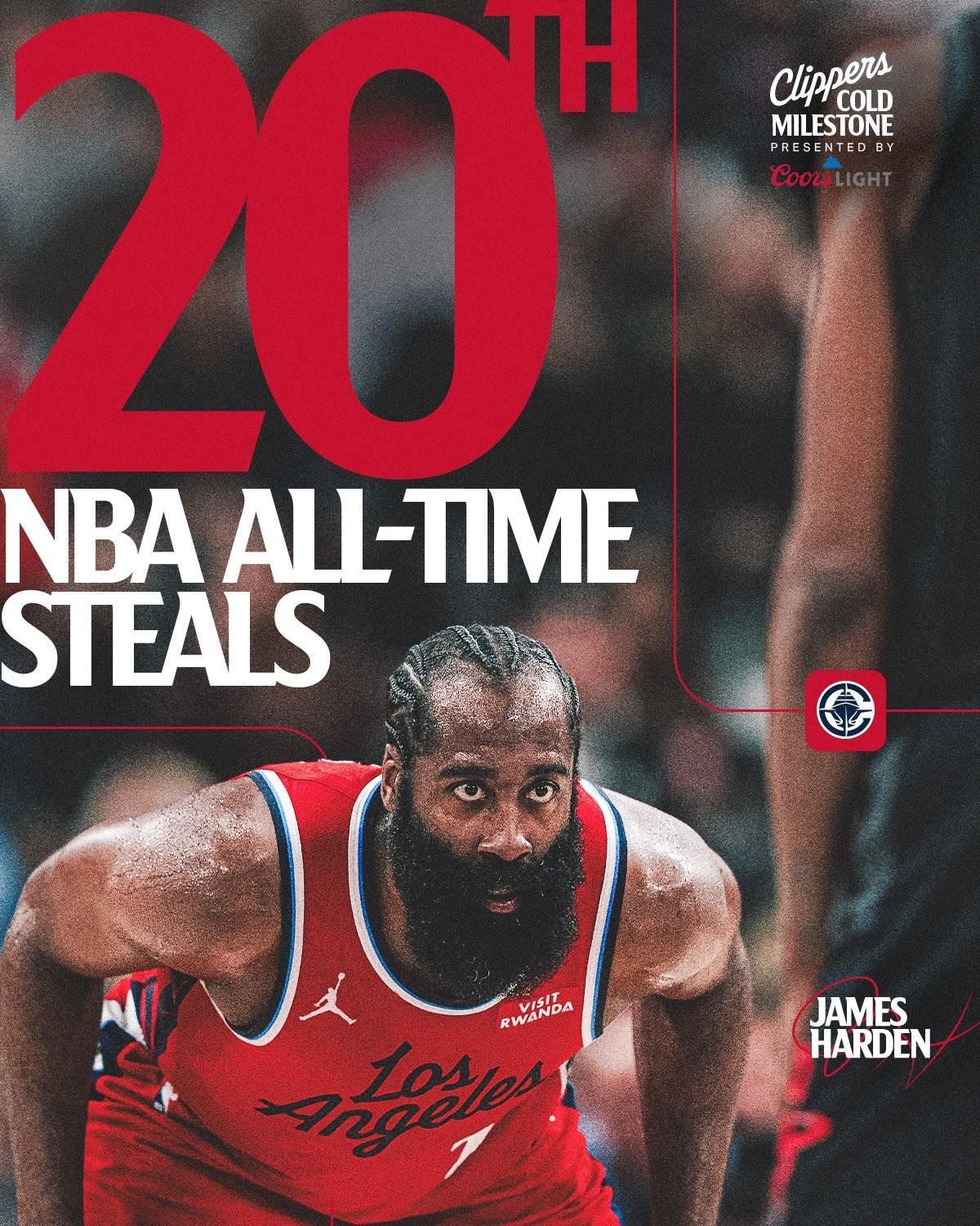 快船后卫哈登上半场完成2次抢断,至此,他在NBA历史抢断榜上超越伊戈达拉,排名历史第20。