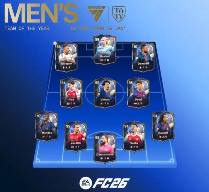 北京时间1月15日,EA公布了FC26年度蓝的正选名单,姆巴佩、哈兰德、登贝莱搭档锋线,中场则是赖斯、维蒂尼亚和佩德里,11人当中有7人都是首次进入正选。